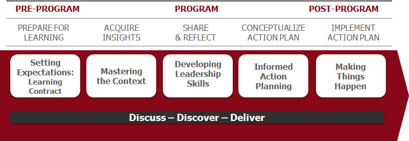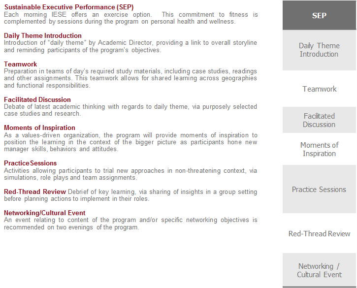 The programme follows a blended learning approach using a variety of tools and methods. IESE’s business-led learning experience includes pre-program virtual work, a residential element and  post-program virtual work.  The residential program is the centerpiece of a participant’s engagement which is based upon a model of Discuss, Discover, and Deliver.
