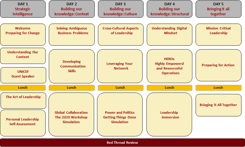 Participants will leave the program with the broader, people-focused mindset required of a manager.  They will be armed with new skills to make better decisions, manage for change, address opportunities, foster collaboration, and lead. Finally, they will have an action plan on how they can support UNICEF as it implements its new mid-term strategic plan.